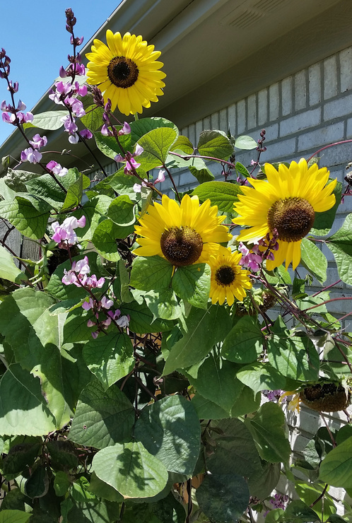 While cutting pieces for the bee hotel, I couldn't help noticing the hyacinth vines battling the chipmunk planted sunflowers.... and! First sedum flower buds appearing on a minature my neighbor gifted me last fall!