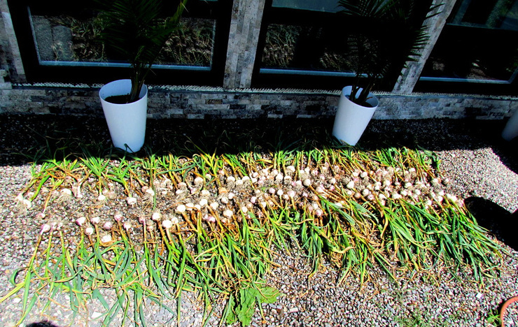 The first harvest of garlic from this morning, about 175 bulbs were ready to be pulled, washed and set out to dry in the sun. There will be at least two more harvests as the rest of the crop ripens.
