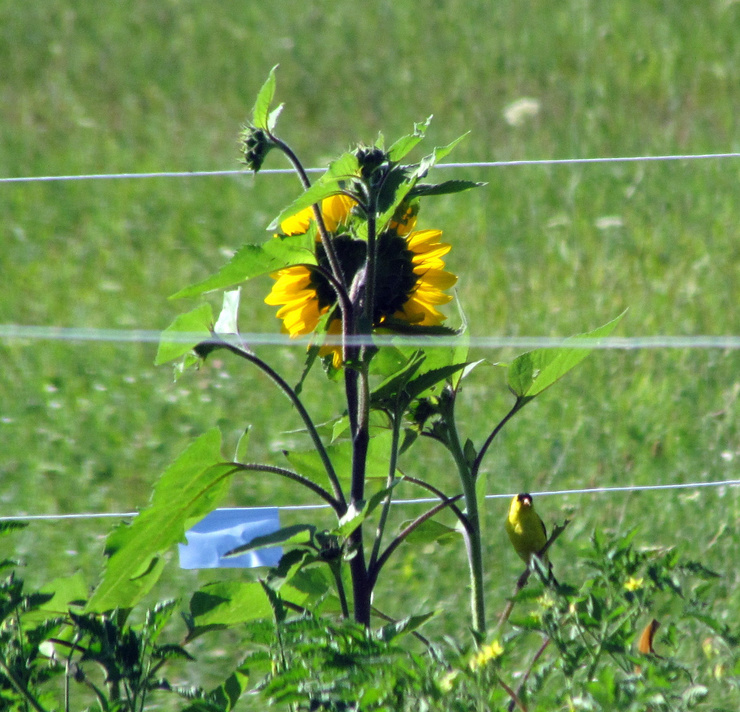 A pair of Goldfinches on pest control duty this morning, working the sunflowers in the garden.