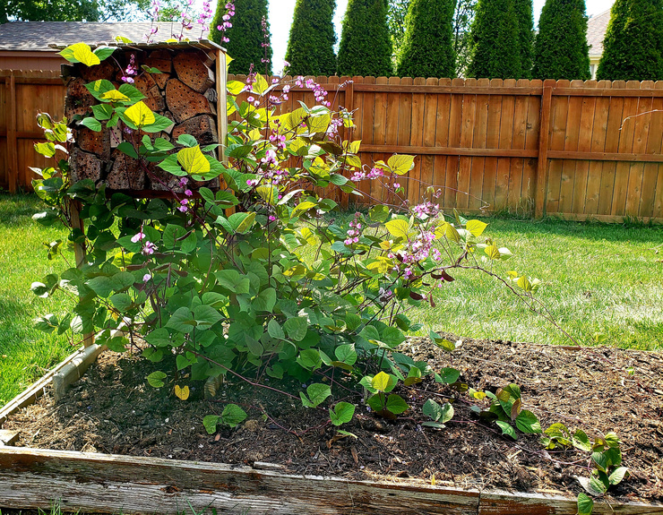 A Yard Long Red Noodle Bean has finally popped, and I believe a few more are almost ready to bloom! Next year I will get seed to start many more (2 of 3 seedlings remain from my impulse purchase). The lavender blossom was so sweet!