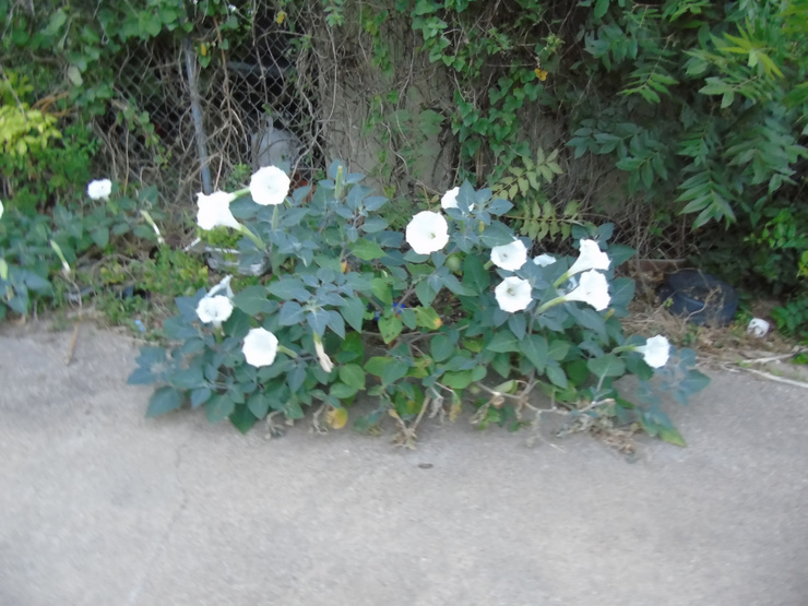 My 2 dartura with tonights blooms. the black mass in the center of the flower is a cluster of honeybees
