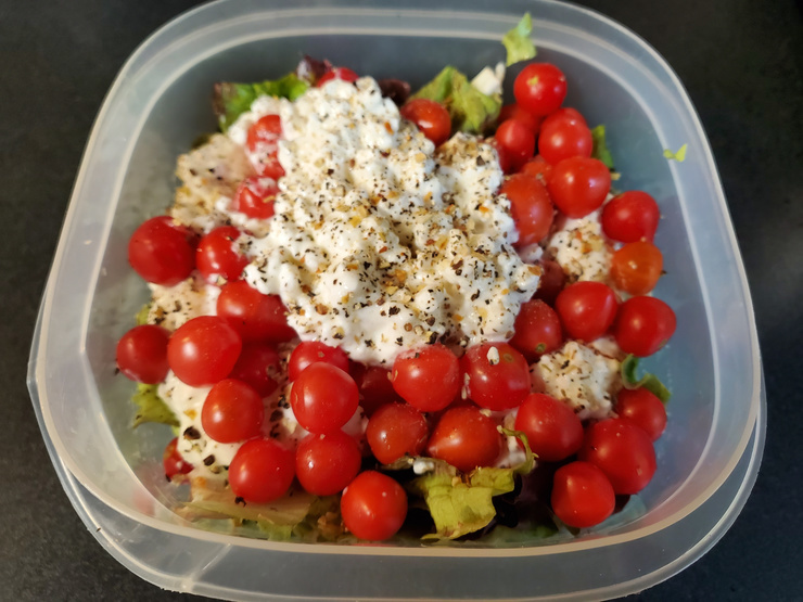 Sometimes Simple is Best... Fresh lettuce from the garden and grape tomatoes from my living room with cottage cheese, cracked pepper, and herbs...