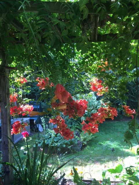 This is the time of year when my little garden is still lush, and the trumpet vine that shades my bedroom window from southern sun is in full bloom. Each morning I step out of bed, pull back the darkening curtains, and see this!