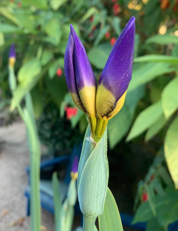 My one Iris has finally bloomed. If anyone recognizes it, I would love to know what kind it is. Two days ago the flowers buds had emerged from the leaf/stem. All three of the blooming leaf/stems are doing everything at the same rate. I'm curious ...