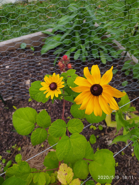 My first raspberries, hiding behind some rudbeckia blooms. I didn't expect berries until second year. I only planted them in March. This site is still rotating all my pics, btw. It is not me, I swear! Lol