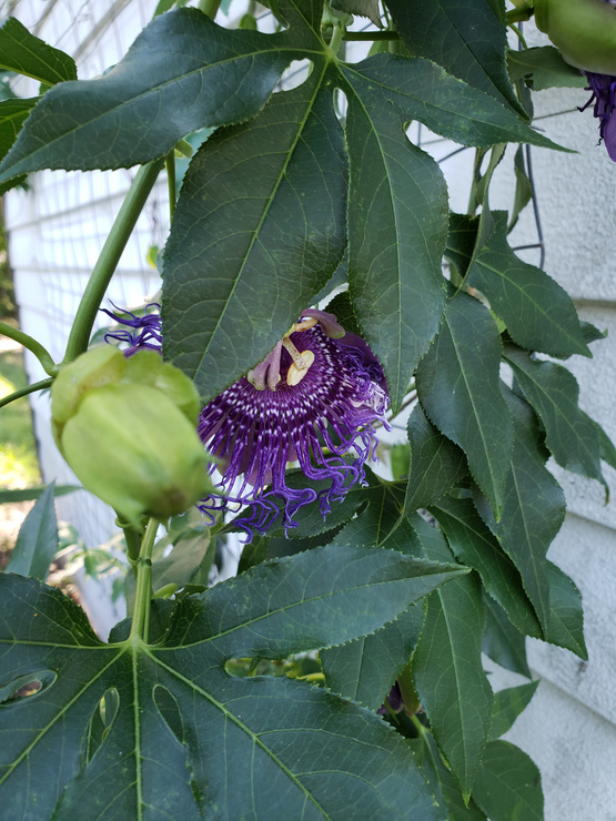 My passion fruit vine is happily growing and full of buds. I can see that showy purple flower from a distance.