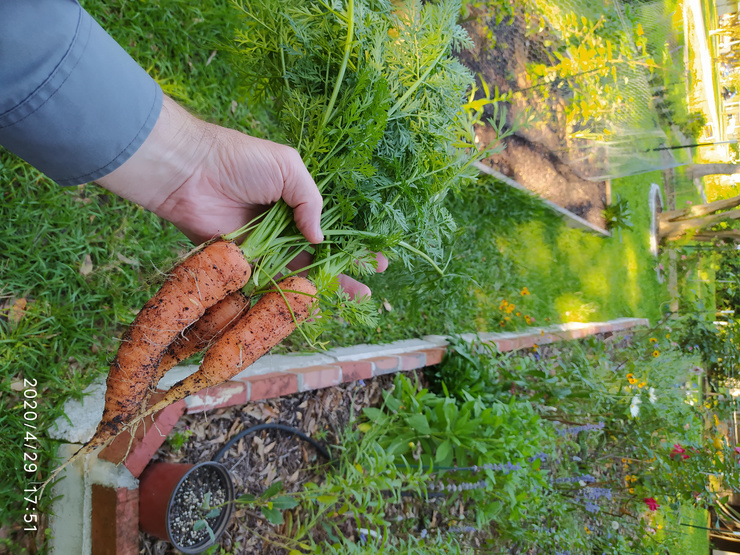 I pulled up a couple little carrots 4 weeks ago and have to admit they were bland. I am inexperienced with carrots, not sure if the soil was nutrient-poor or what. Turns out they were just immature. Pulled these babies a few minutes ago, and Oh! ...