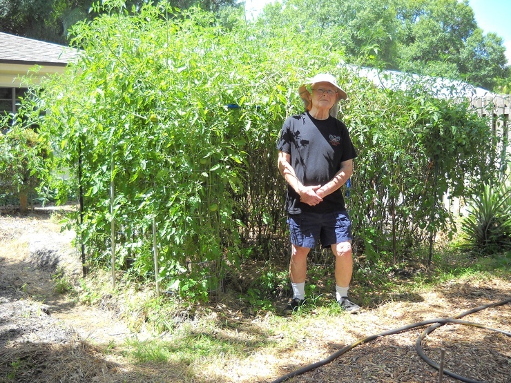 Attached is a picture of my tomato plants today. They grew to almost 10 feet tall then fell over and formed a canopy between the rows. The tallest now are still between 8 and 9 feet tall.