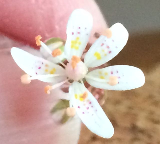 Beautiful tiny things: I have had my little Saxafraga x geum ‘Dentata’ plants for several years now, and only now did a close inspection of the blossom, measuring just 11 mm, less than 0.5 inches. Look at all that itty-bitty dot pattern, just ...