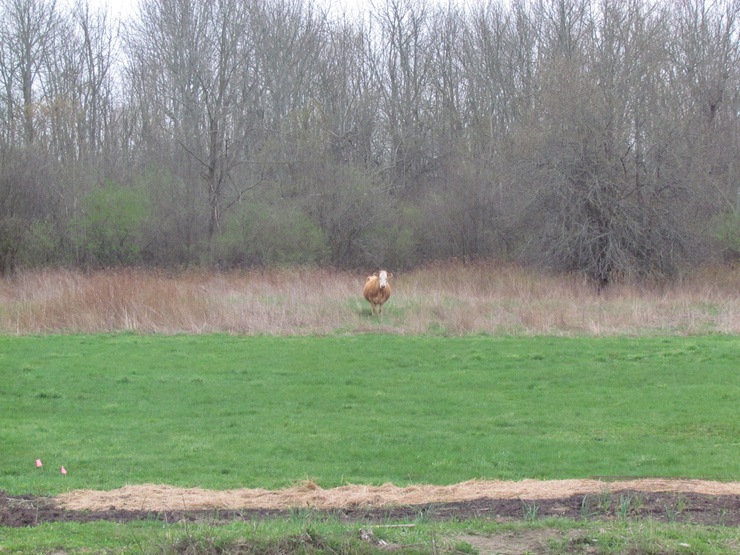 We had an early morning visitor today, guess the cow jumped over the moon and landed in our backyard. He was a bit skittish and as soon as I opened the door he made a beeline back to the hole in the farmer's fence through which he/she had escaped.