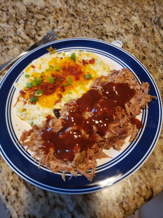 Posted by AiveryKeto southern food. 2 carb BBQ sauce, Mashed cauliflower with sour cream, shredded cheese, bacon bits, and green onions.