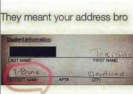 @FrayedBear The guy instead of writing his home address, he wrote his nickname. He probably got his nickname from being in a gang, also known as street name.