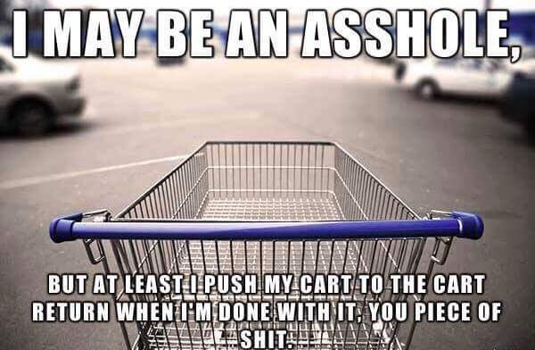 There are some real lazy ass fucktards out there. Nothing twurks me more than seeing a cart sitting in the middle of a parking space. Just want to find the dipshit and throat punch em.