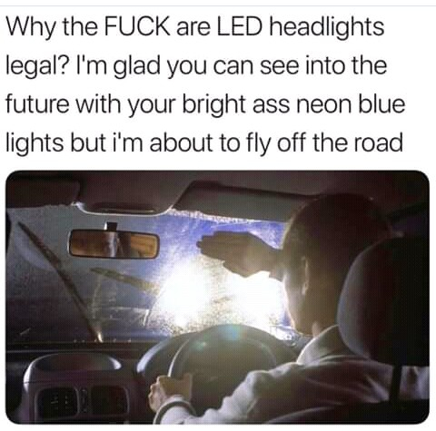 @FrayedBear agree with your that in many cases it's badly aligned lights, and not necessarily LEDs. Halogens can be pretty freaking bright too.