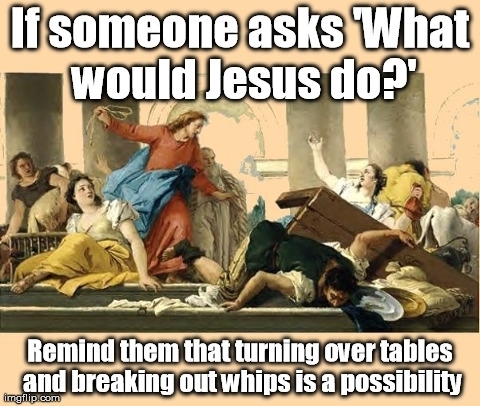 Petunia won't let me put a bumper stick on our car that says "What would Jesus do? Whip his banker."