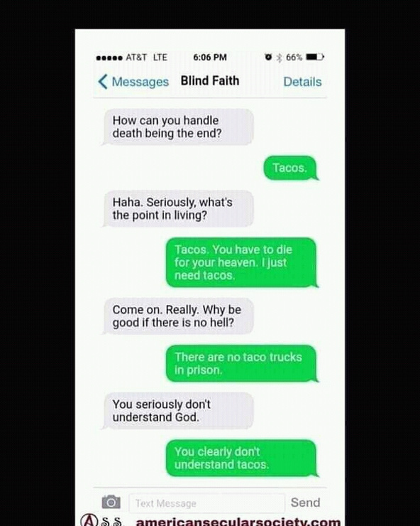 I absolutly love " Why be good if there is no heaven, there are no taco trucks in prison"
