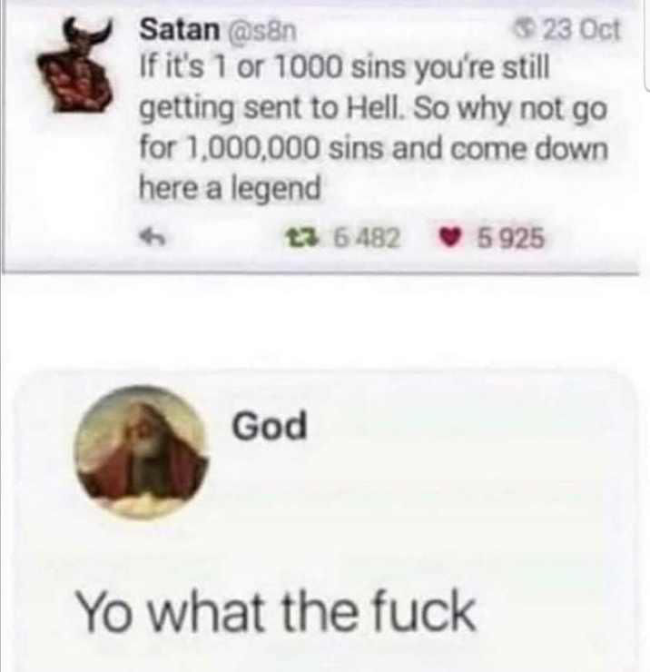 Posted by backtobasicsPeople swear there is no heaven, but pray there is no hell.