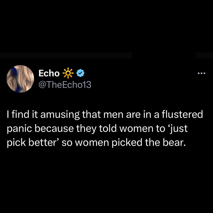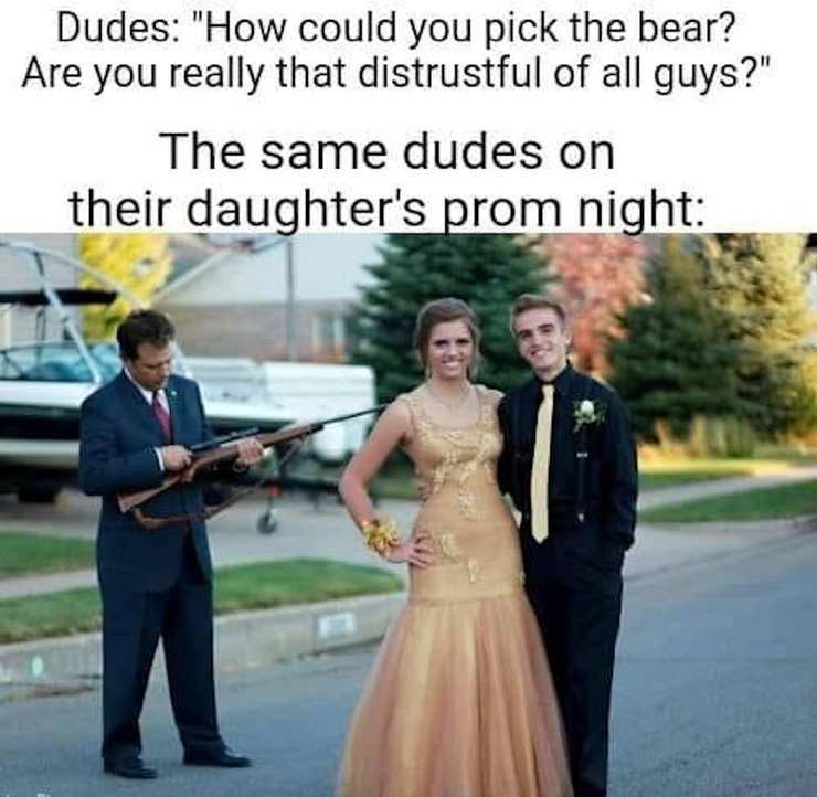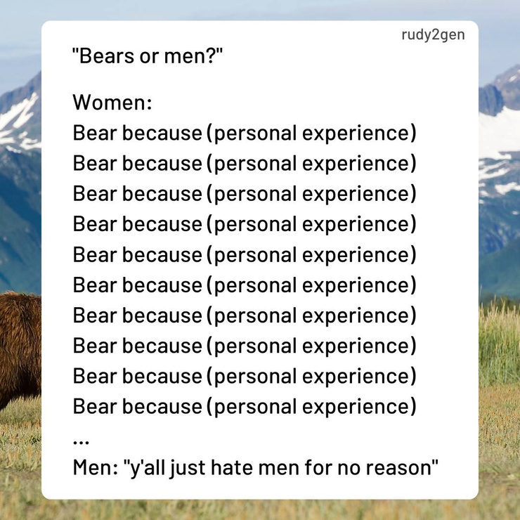 A few things that people (fellas) seem to not understand about the bear vs man thing: The scenario is, a woman is walking through the woods hiking alone. Whilst hiking, would they rather come across a bear or a strange man? The question is not: Who ...