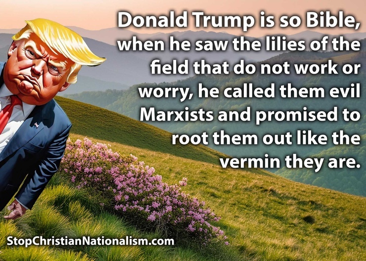 Donald Trump is so Bible, when he saw the lilies of the field that do not work or worry, he called them evil Marxists and promised to root them out like the vermin they are.