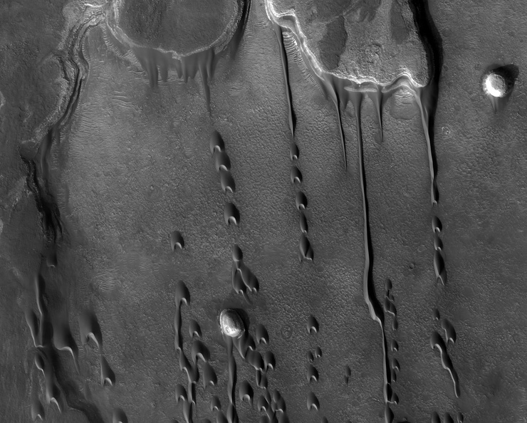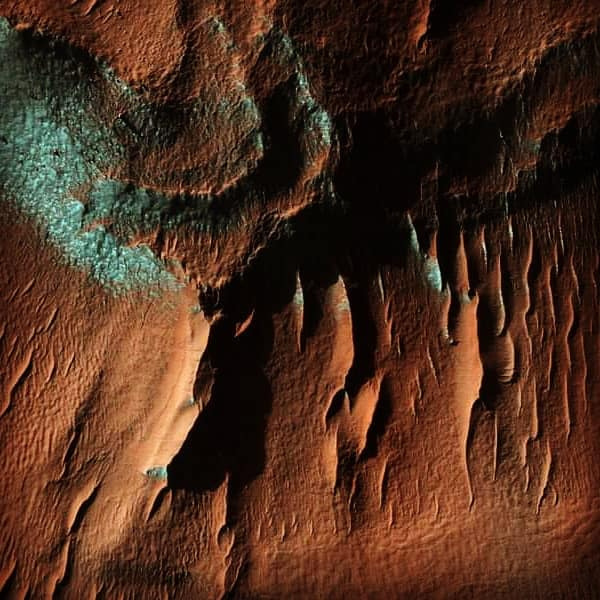 Frost on Moni. Mars. The Moni Crater is a 5-kilometer crater with ravines on its walls and curved ridges on the ground that meet at the distal ends of the rubble platforms of the ravines. In addition to knowing the formation of the ridges, another of...