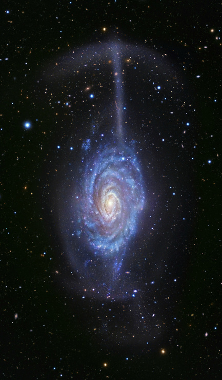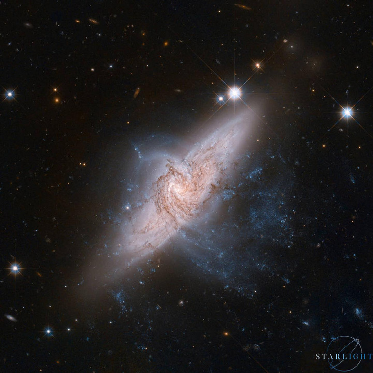 The Hubble Space Telescope captures a rare view of overlapping galaxies, called NGC 3314. They are about the same distance apart as Andromeda and the Milkyway.