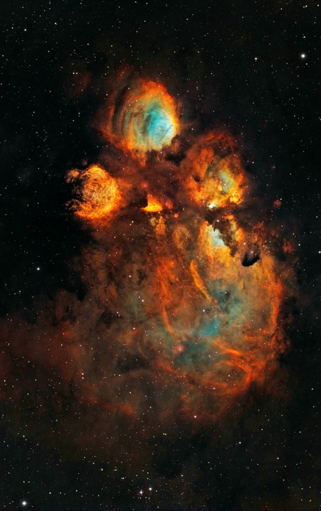 At 5,500 light years distant, the Cat’s Paw nebula NGC 6334 is an emission nebula with a red colour that originates from an abundance of ionised hydrogen atoms.