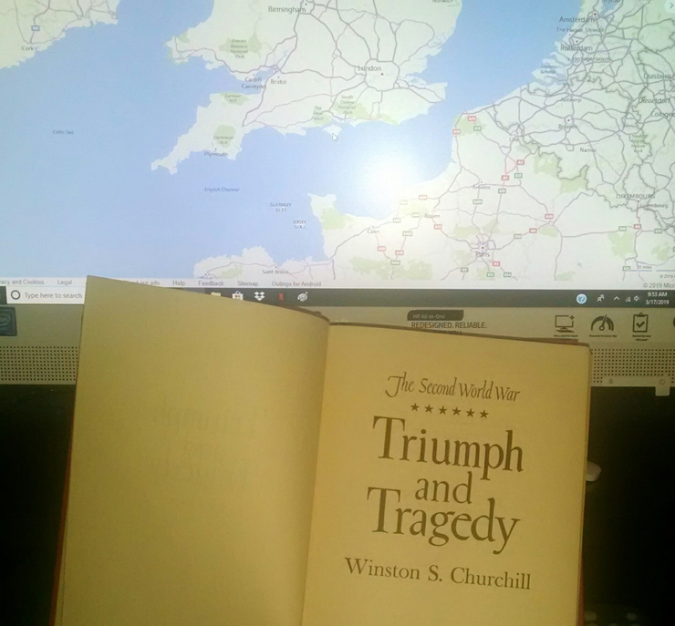 Sunday read with Maps app to see where each location is placed on the map, nice large coffe while it is still snowing. The book is a recount of WWII events by none the less the great character Winston S Churchill. This is a rare book you don't want ...