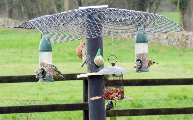 Not a pretty feeding station but the birds are, here two pic’s showing Goldfinches, Great tits Blue tits and coal tits… Not great pic’s but you get the idea…