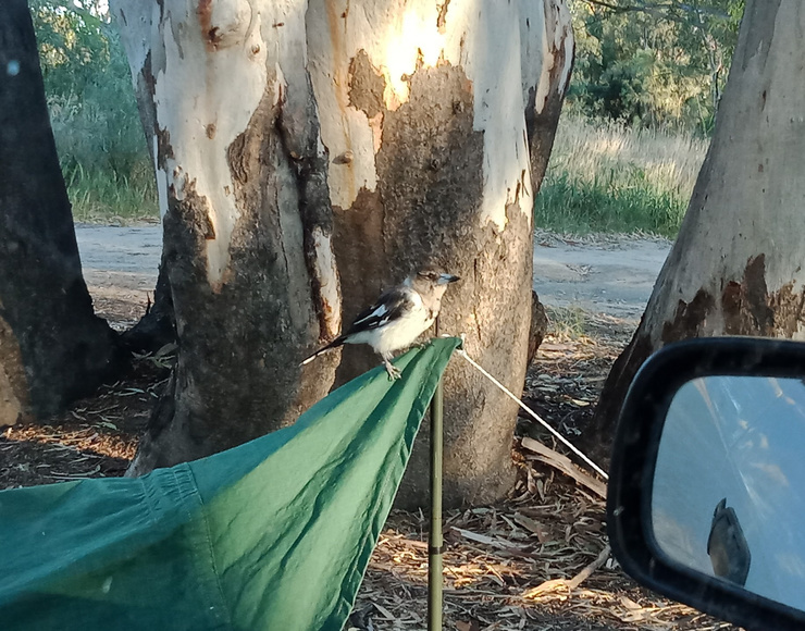 getting a wake-up call by this baby butcherbird, scrabbling for purchase on the slippery slope of my swag, made my day already at 6 in the morn. i love australian bush life!