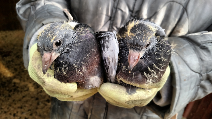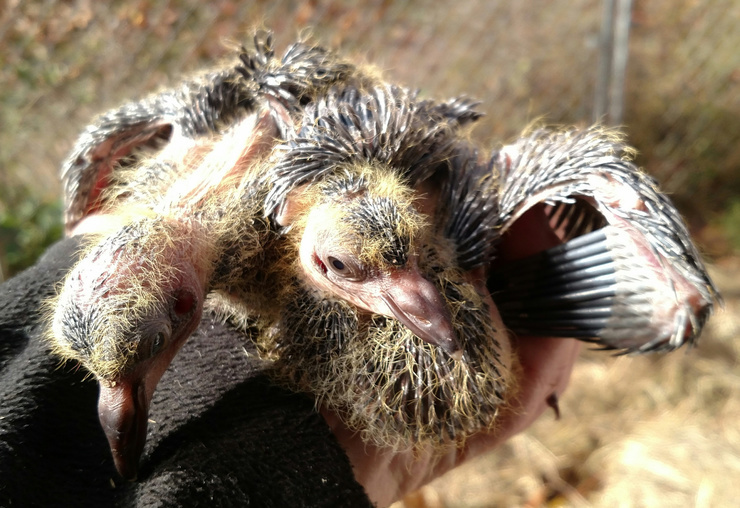 I spent this morning up at my parents' "farm", as I wanted to clean out the run-in side of the barn where my llamas, pigeons, and geese hang out. I was pleased to find 5 active pigeon nests with some nice looking babies! Three pairs, two singles, ...