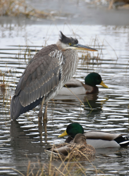 Great blue heron and a killdeer looking none too pleased about this cold weather we're having.