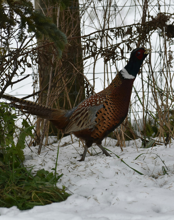 This fellow was running up and down the fence line trying to figure out how to get through. (The fence belongs to a deer farm, so it's probably 10' high box wire.) His buddy had made it over and had run off into a field, but this guy wasn't figuring...