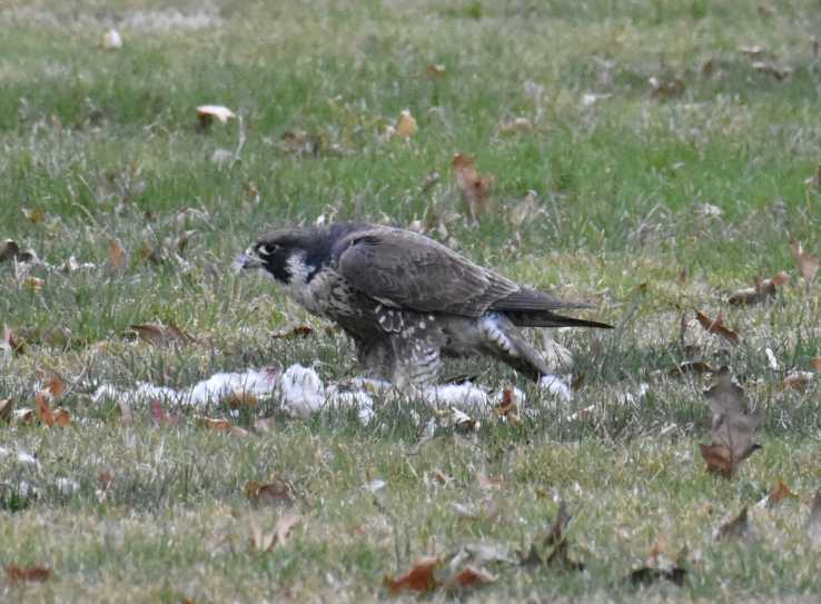 I stopped by one of my favorite spots for watching ducks and was surprised to see the wasn't a single duck on the pond. Very unusual! Then I saw this guy in the adjacent field snacking on a female wood duck and it all made sense. Peregrine falcon;...