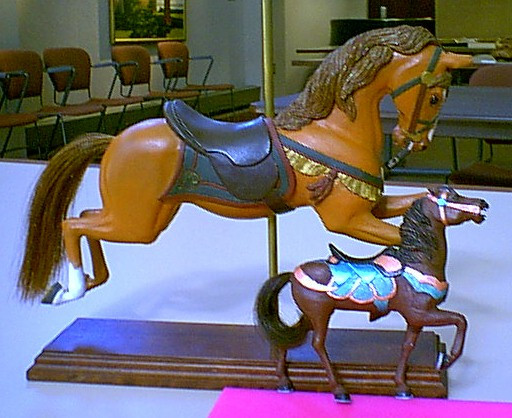 A couple of my miniature carousel horses and a picture of the class projects from one of the carousel carving classes I taught at the MAWC seminar in Nebraska.