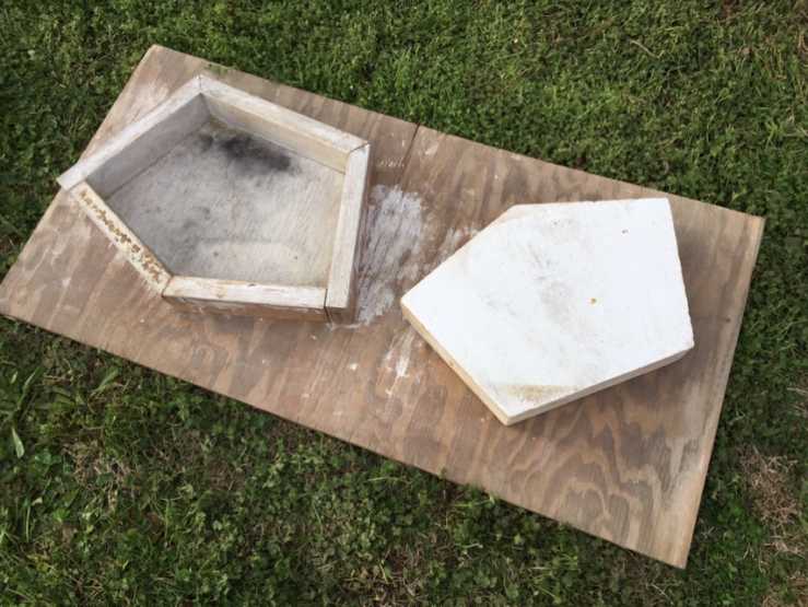 1. Make wooden mold to pour plaster blank. 2. Carve blank to look like stone. 3. Make silicone rubber and fiberglass mold. 4. Cast concrete stones for patio.