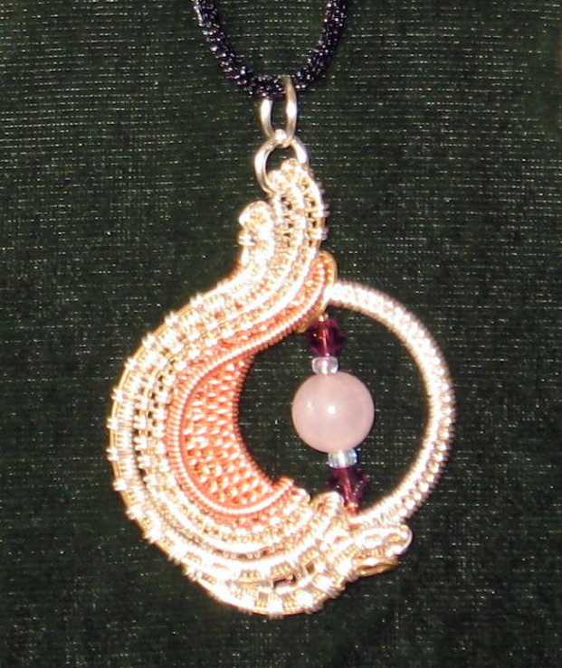 Latest pendant, there a 5 different weaves and 1 coil. The pink bead is rose quartz and 2 amethyist colored Swaroski crystals.