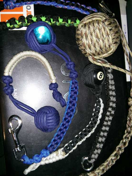 All these are made with 550 paracord it's pretty relaxing doing the braiding. I got 1 oz steel ball-bearing, I got 40 mm blue crystal ball and miniature 8 Ball and the real big one is a tennis ball with a golf ball inside of it and hard foam.
