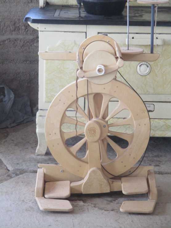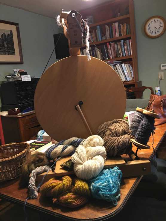 My wheel and some skeins I spun The wheel is a double treadle Louet ( from Holland) A small section of the yarns I spin are on the table. The white and blue one is a Romney sheep wool and shredded bluejeans ( cotton) The pure white skein is Cormo ...