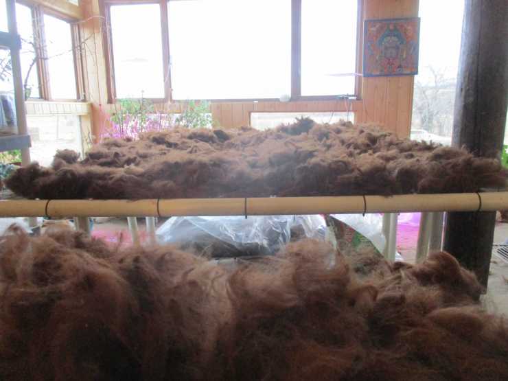Part of the mountain of brown alpaca fleece I am sorting and carding