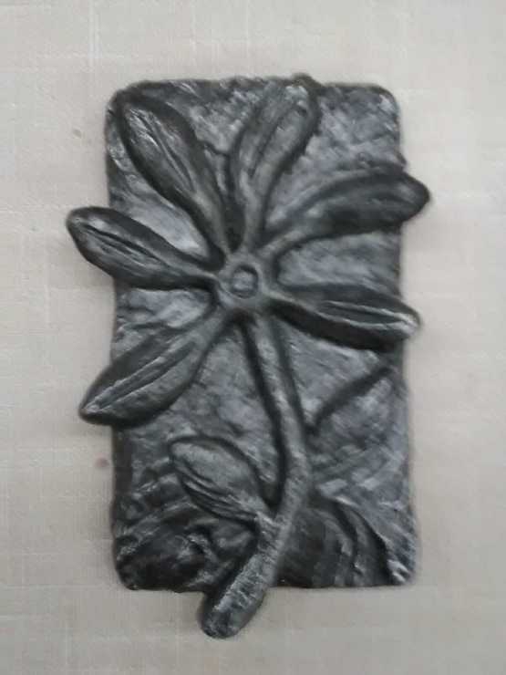 I make cast iron sculpture by recycling old steam radiators. This tile is about 4"x6".
