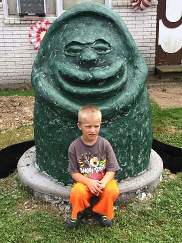 Child of a friend in front of a stone spirit that I made last summer...it's planted all about now with zebra grass and phragmites.