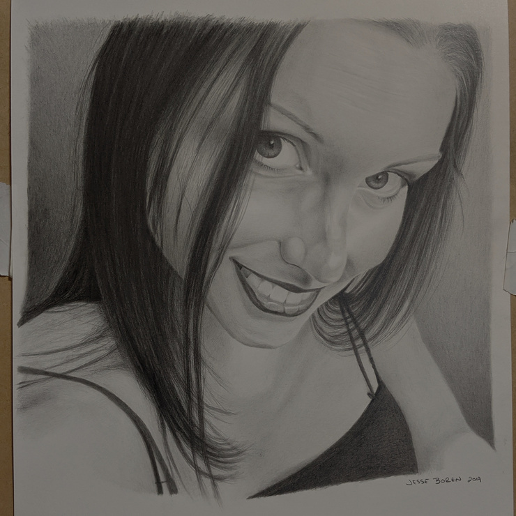 I just finished this portrait drawing. It's pencil on 300 series Bristol vellum. It took around 30 hours to finish.