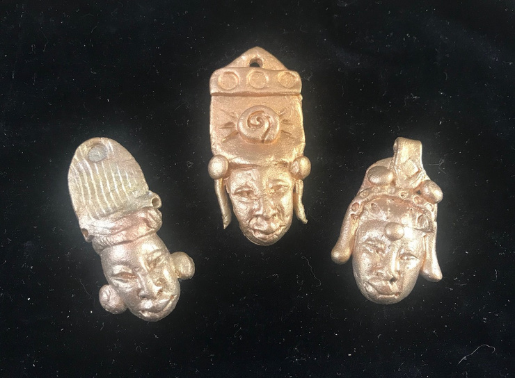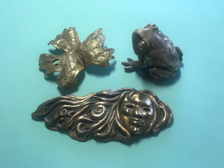 After some minor disasters and loss of nerve, I had a good firing today with the bronze clay - these are the first 3 small pendants ready for Xmas. Solid bronze sizes 1.75-2.25" . I might patina them a bit? and hang on plain black cord. (new and ...