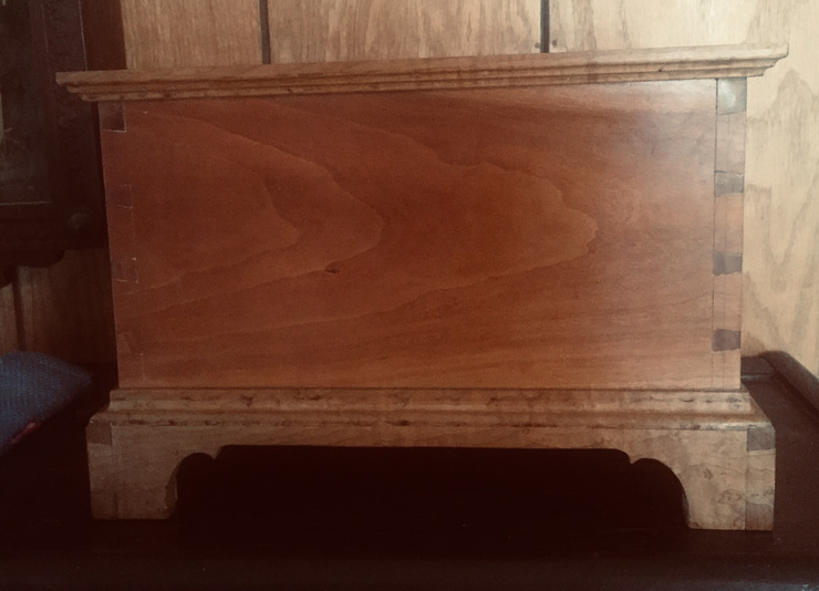 A miniature blanket chest that I made a few years ago. The box is cherry, the lid birdseye maple and the feet are curly maple. I like to recreate antique pieces often using traditional handtools. I have made a few of these over the years.