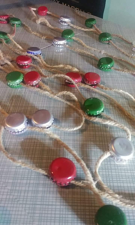 I made a garland from painted bottle caps and recycled twine. I may be agnostic but still like holiday decorations.