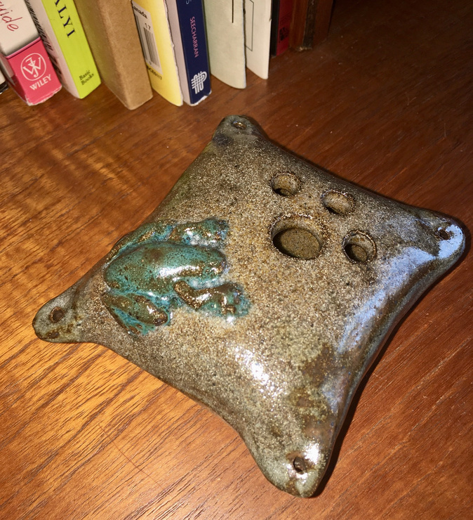 A while ago I shared the prototype small Ikebana pillow vase that i made, and promised one to @Hathacat. Stuff moves very slowly in the chain of firing at the community college, but at last I got two stoneware ones! Here is one of them, with a little...