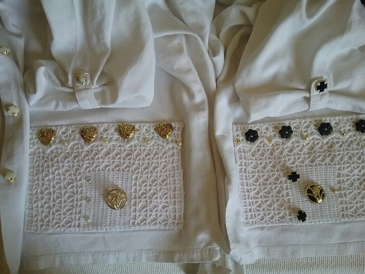 I'm repurposing a big linen shirt into a light jacket. I added pockets with crochet last year. It was okay but I wasn't happy with it yet. So I'm adding buttons. And I'll add a closure at the top of the pockets. The buttons on the pockets aren't ...