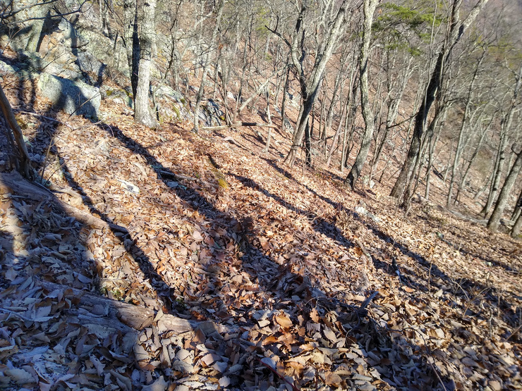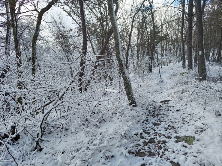 More ice and snow than I expected. In the shady parts, the trail was shear ice-over-snow sloped perpendicular to the desired direction of travel. Exciting. Flat Top Mtn, VA, 4001 ft, 7mikes rt