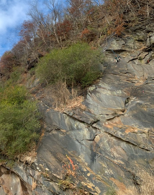 This is about 50' tall, called the Bluestone Amphitheatre in Amherst county, VA. We climbed last Friday. That's my son posing. Colorful rock, yes?