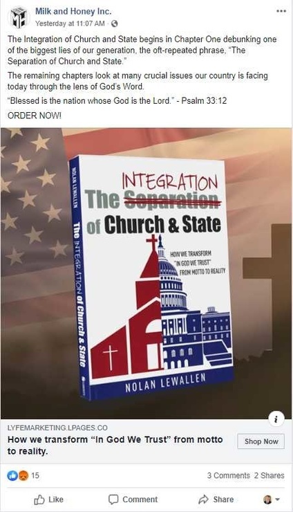 Saw this craziness as I was scrolling through my Facebook News Feed. "The Integration of Church and State begins in Chapter One debunking one of the biggest lies of our generation, the oft-repeated phrase, “The Separation of Church and State.”